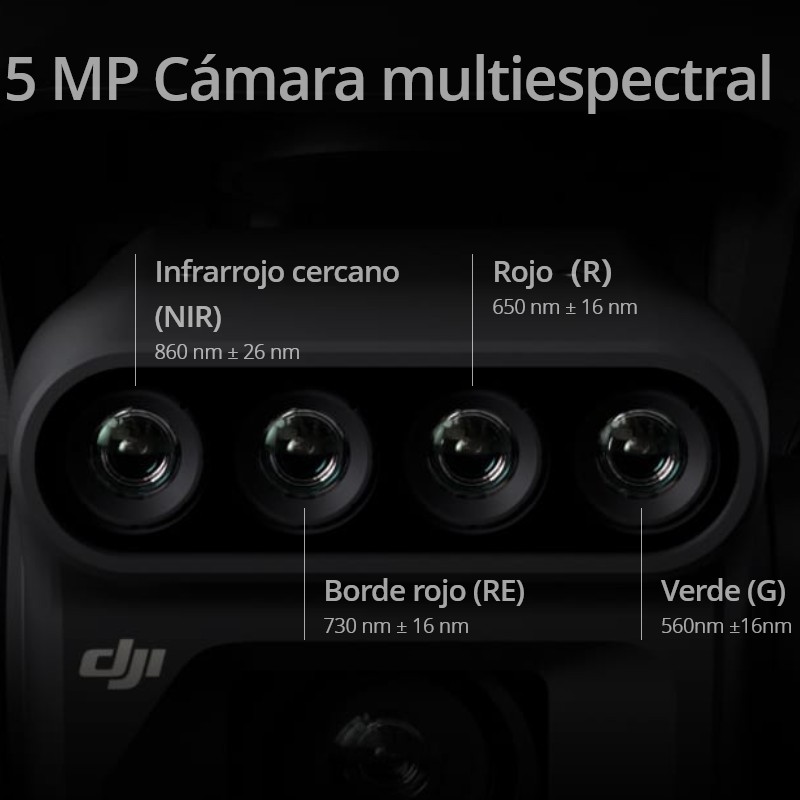 Sistema de imágenes multiespectrales + RGBSistema de imágenes altamente integradoNuevo sistema de imágenes actualizado con una cámara RGB de 20 MP y cuatro cámaras multiespectrales de 5 MP (Verde, Rojo, Borde Rojo y Infrarrojo Cercano). Cámara multiespectral – 5 MP