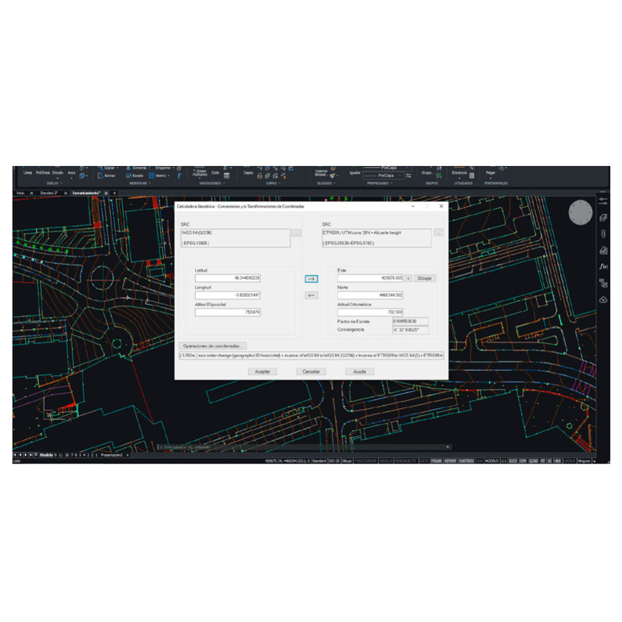 Módulo de TopografíaSistemas de referencia de coordenadas con cobertura mundial. Realiza transformaciones globales o locales de puntos, archivos o dibujos. Procesamiento de observaciones de estación total, cálculo de coordenadas de puntos y compensación de poligonales y redes |